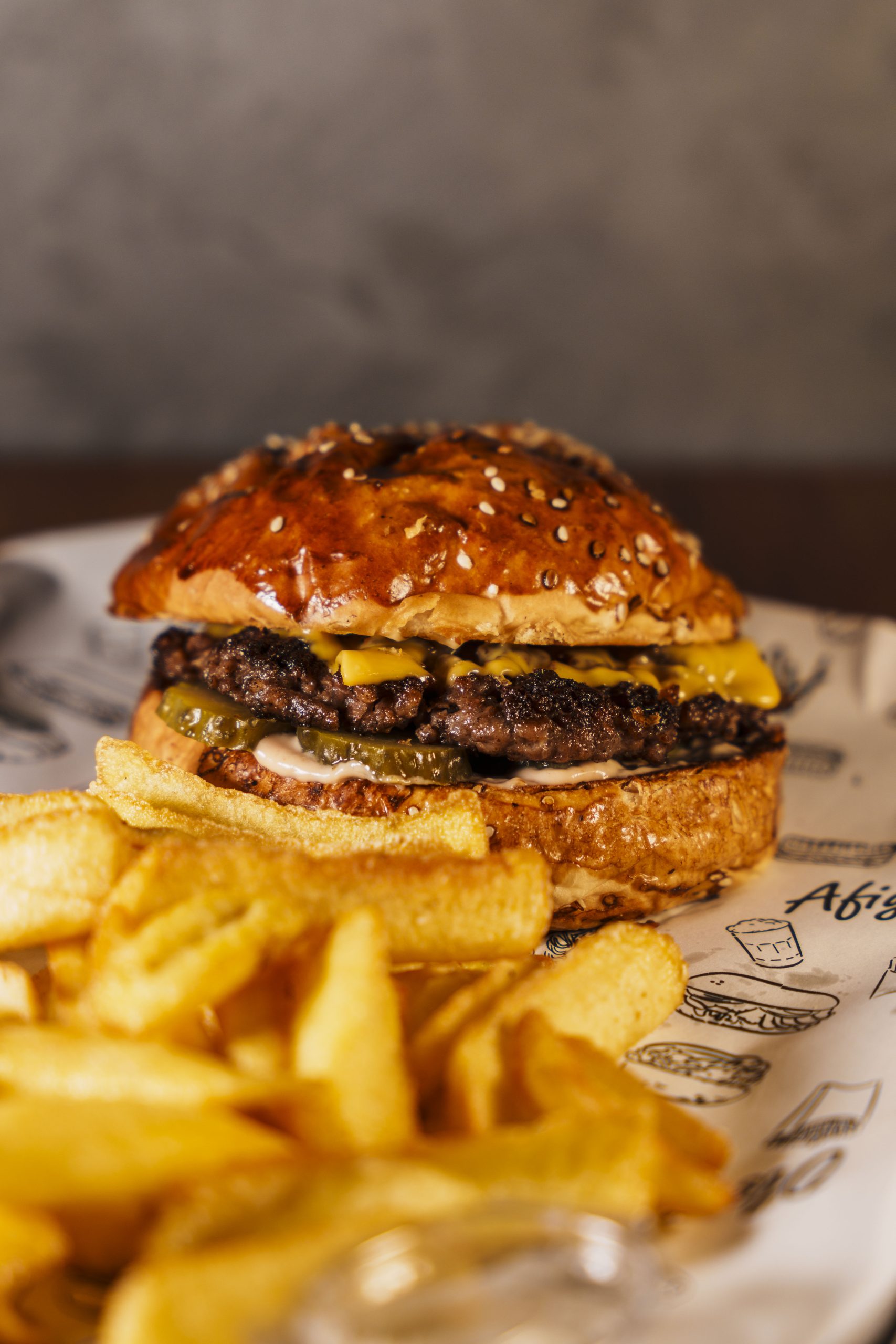 İçindekiler:Burger Köftesi, Cheddar Peyniri, Burger Sos, Turşu. Kaşık patates ve özel soslarıyla servis edilir.
