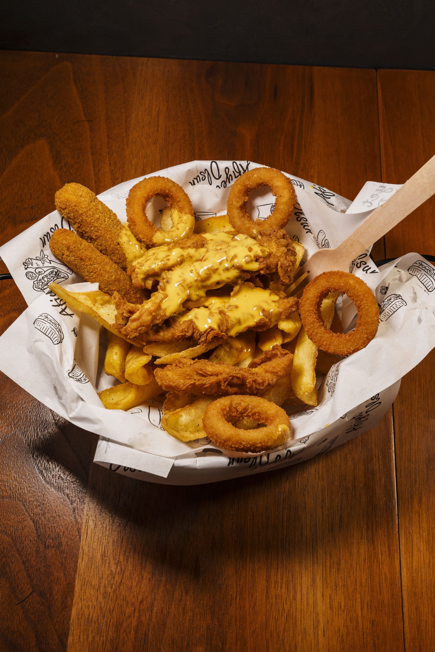 İçindekiler:Patates Kızartması, Dilimli Çıtır Tavuk, Soğan Halkası, Peynir Kroket, Cheddar Sos.